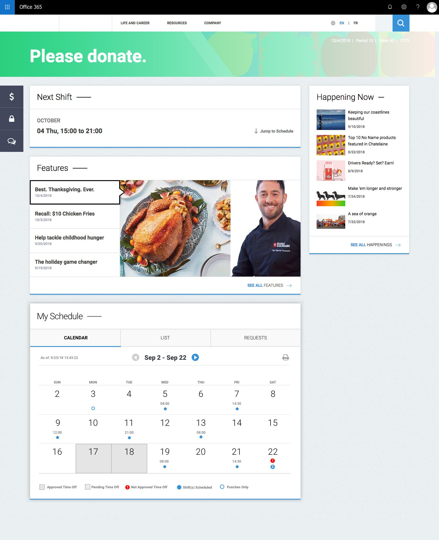 Leveraging existing style guidelines and following an agile development approach, we set out to build a new scheduling application for the intranet. This also had to connect with legacy scheduling applications that were still in use that tied into corporate timekeeping and payroll.